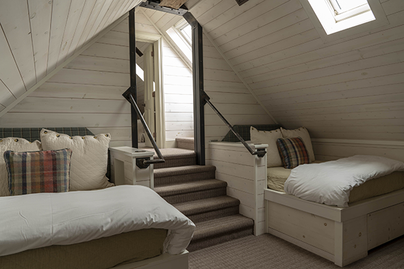 Kid-friendly room located on the second floor with two full beds, two twin trundle beds, skylight, adjoining media room with TV and en suite bathroom with steam shower | 173 square feet