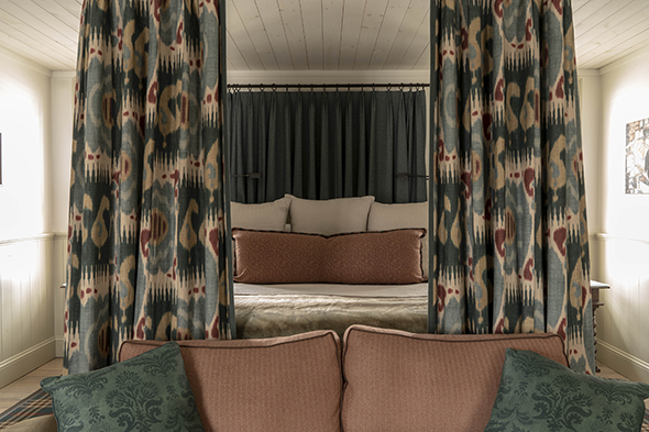 Welcoming first-floor room with four-poster king bed, exterior door to courtyard, television, minibar and en suite bathroom with steam shower | 372 square feet