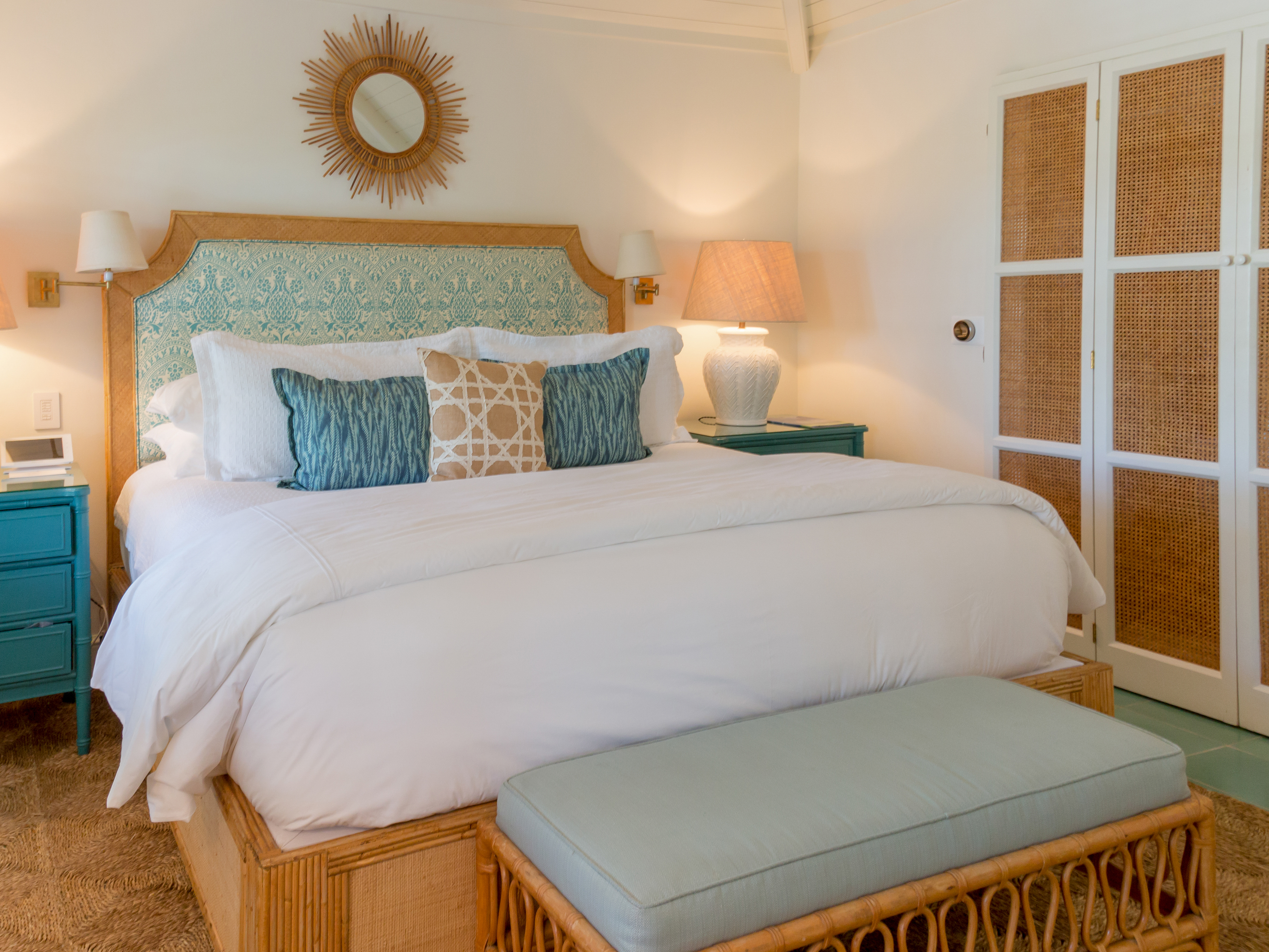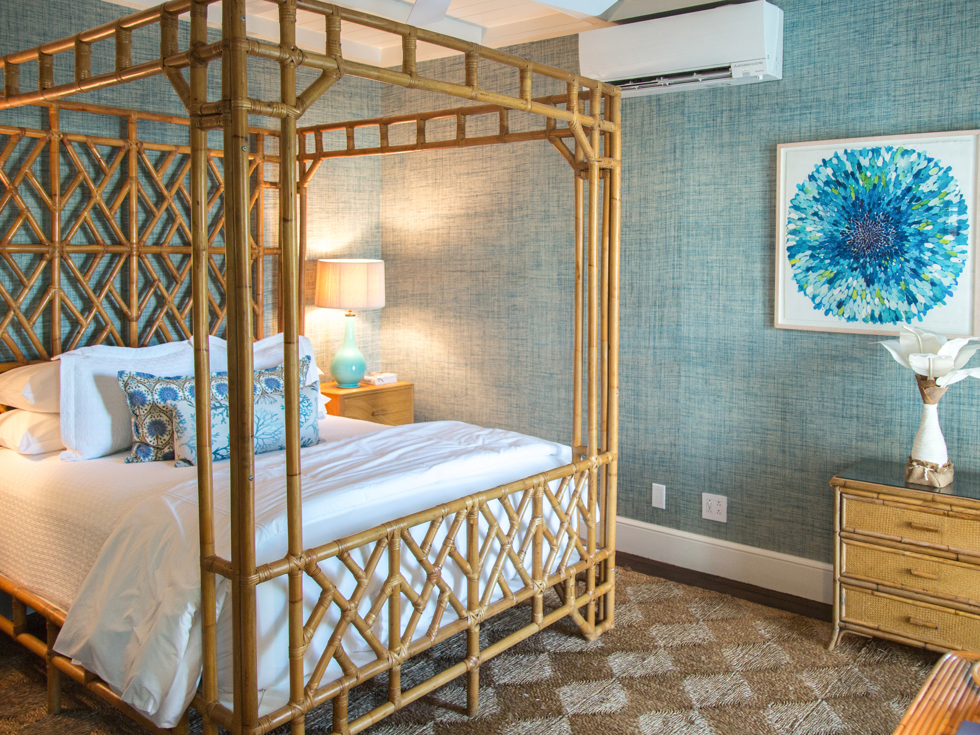Ocean-blue grasscloth room on the ground floor with queen bed, en suite bathroom, television, minibar, plus access to a shared outdoor terrace | 224 square feet