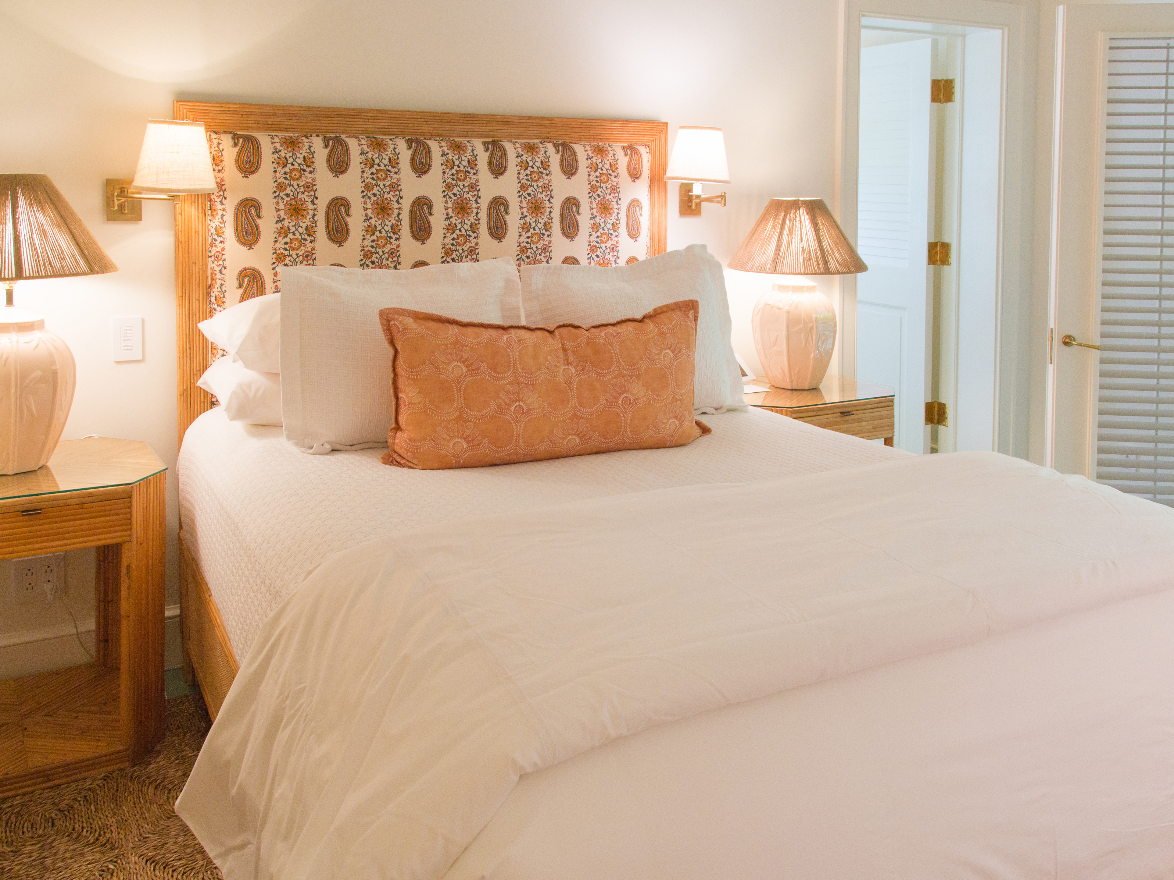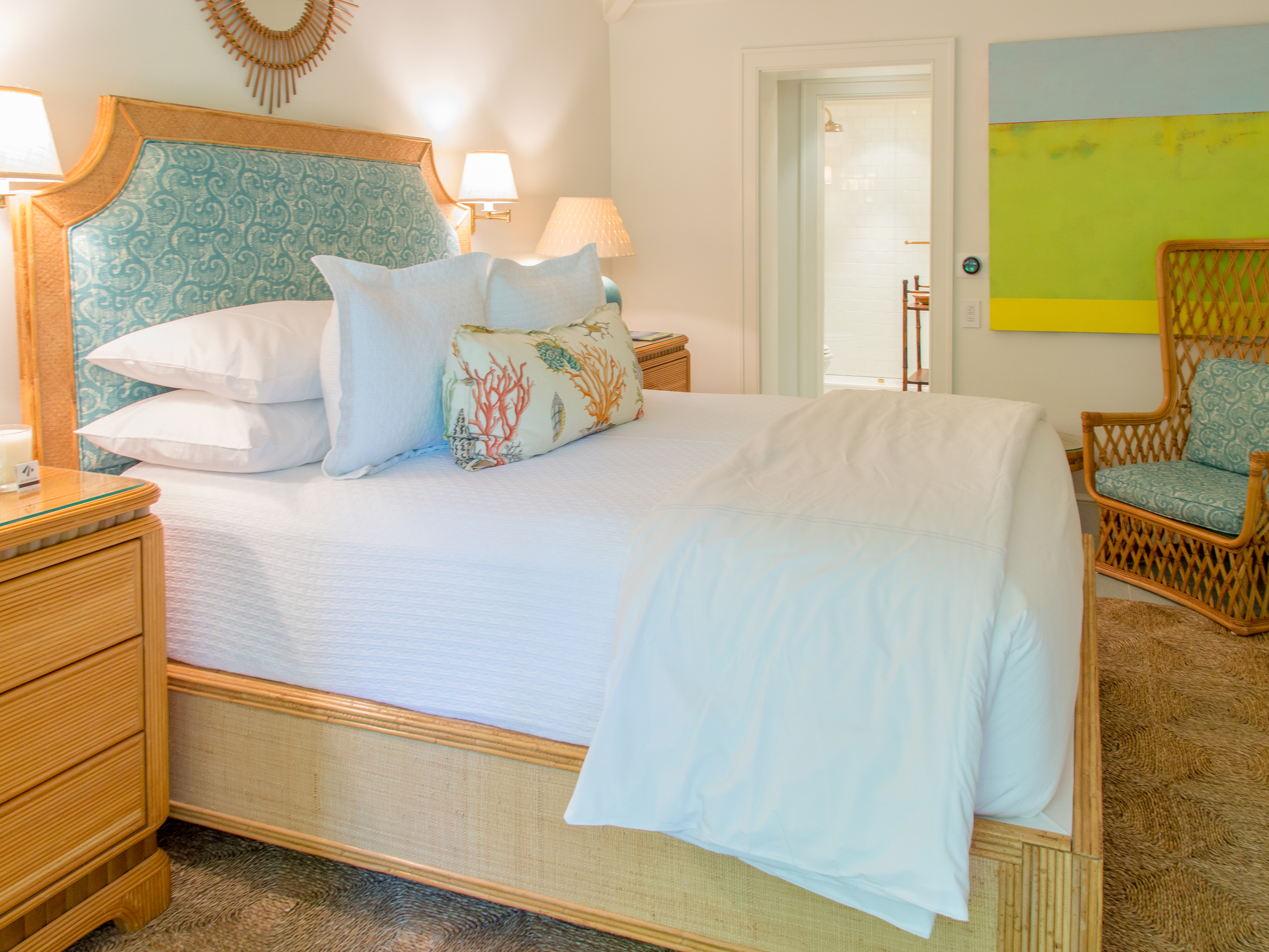 Island-chic room with vaulted ceilings, queen bed, en suite bathroom, television accessible by bed, minibar, plus shared covered porch with access to the rotunda | 203 square feet